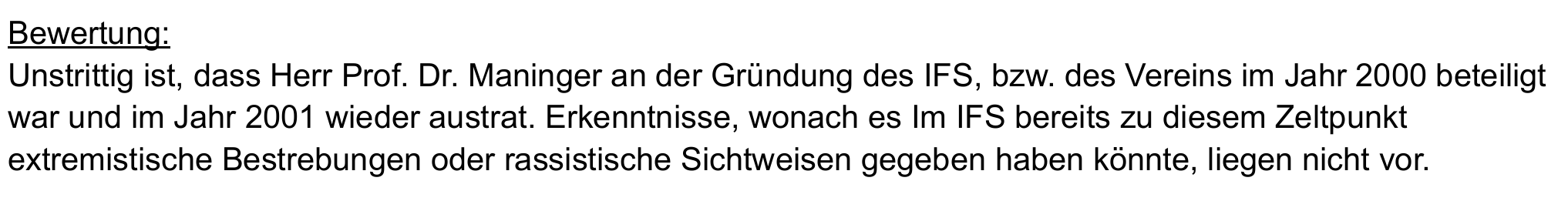 Dass Maninger gemeinsam mit zentralen Köpfen der Neuen Rechten das „Institut für Staatspolitik“ gegründet hat, sei laut dem Bericht unstrittig. Da eine Beobachtung des IfS durch den Bundesverfassungsschutz jedoch erst 2020 erfolgte und Maninger im Jahr nach der Gründung aus dem Trägerverein ausgetreten sei, wertet die Innenrevision seine Rolle als „unkritisch“.